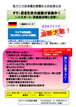 平成27年12月7日 スリや置き引きから身を守ろう! クリスマスシーズンに突入し、ベルリン市内でもスリや置き引きが多発しています。 特に邦人が狙われているわけではありませんが、それでも邦人の被害は実に多いようです。 ![]() 金銭やクレジットカードだけでなく、パスポートを失っても大変なことになります。 是非ご一読ください。 また、ご友人知人の方々にも広く知らせてください。 http://www.de.emb-japan.go.jp/nihongo/konsular/oshirase-nakami/151207higai.pdf
